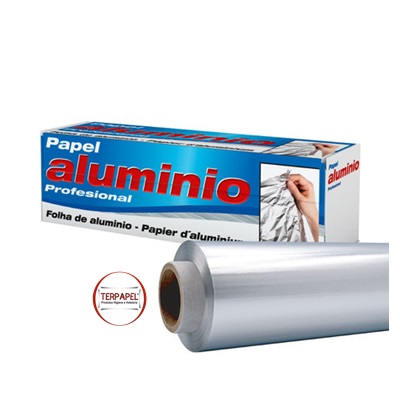Rolo de papel alumínio industrial, com serra dentada para facilitar o corte e fixação para desenrolar.